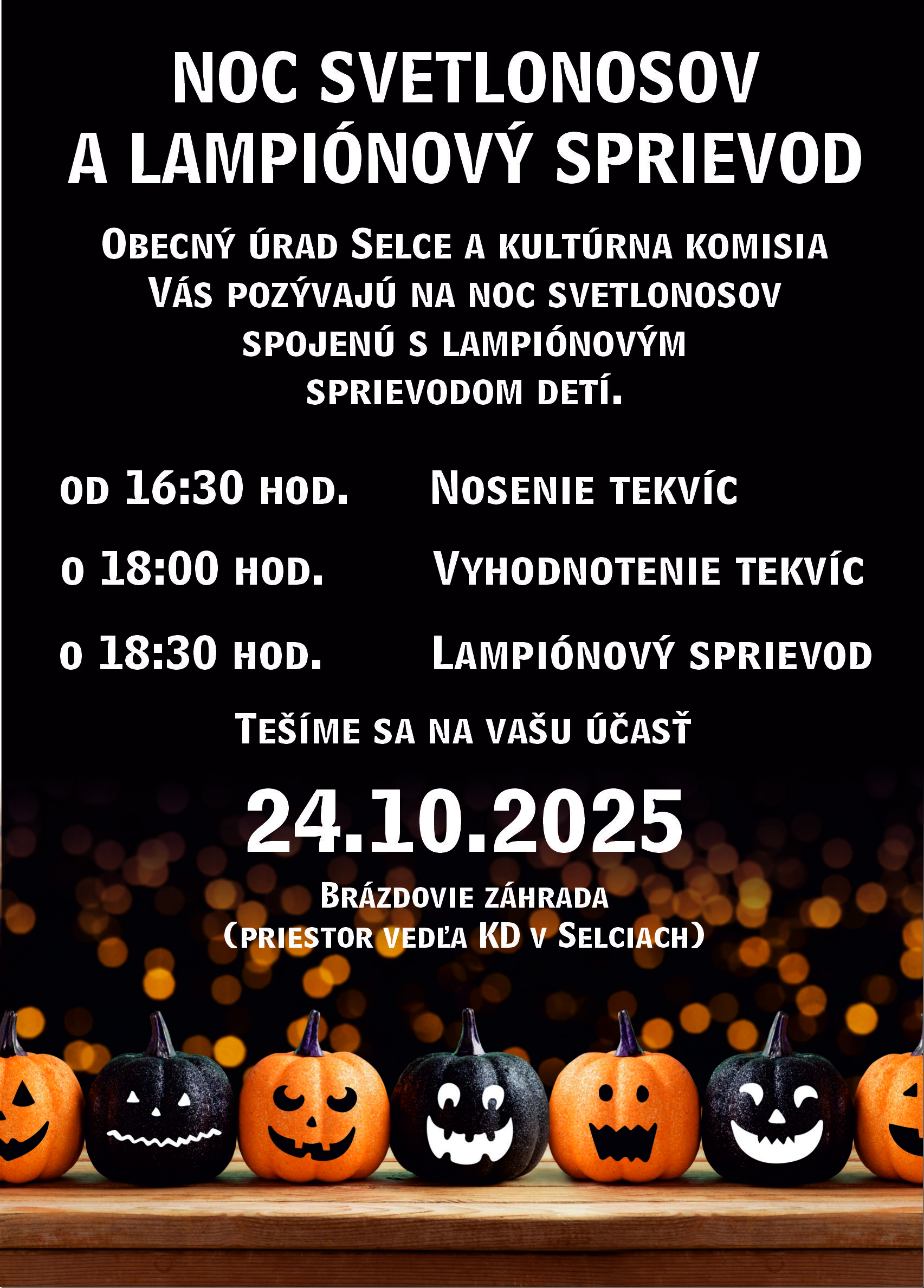 Sprievod bude v piatok 24. októbra na Brázdovie záhrade, vedľa Kultúrneho domu v Selciach. Začiatok je o 16:30 . Príďte si s nami spríjemniť piatkové popoludnie a pozrieť sa na kreatívne výtvory detí a dospelých.
