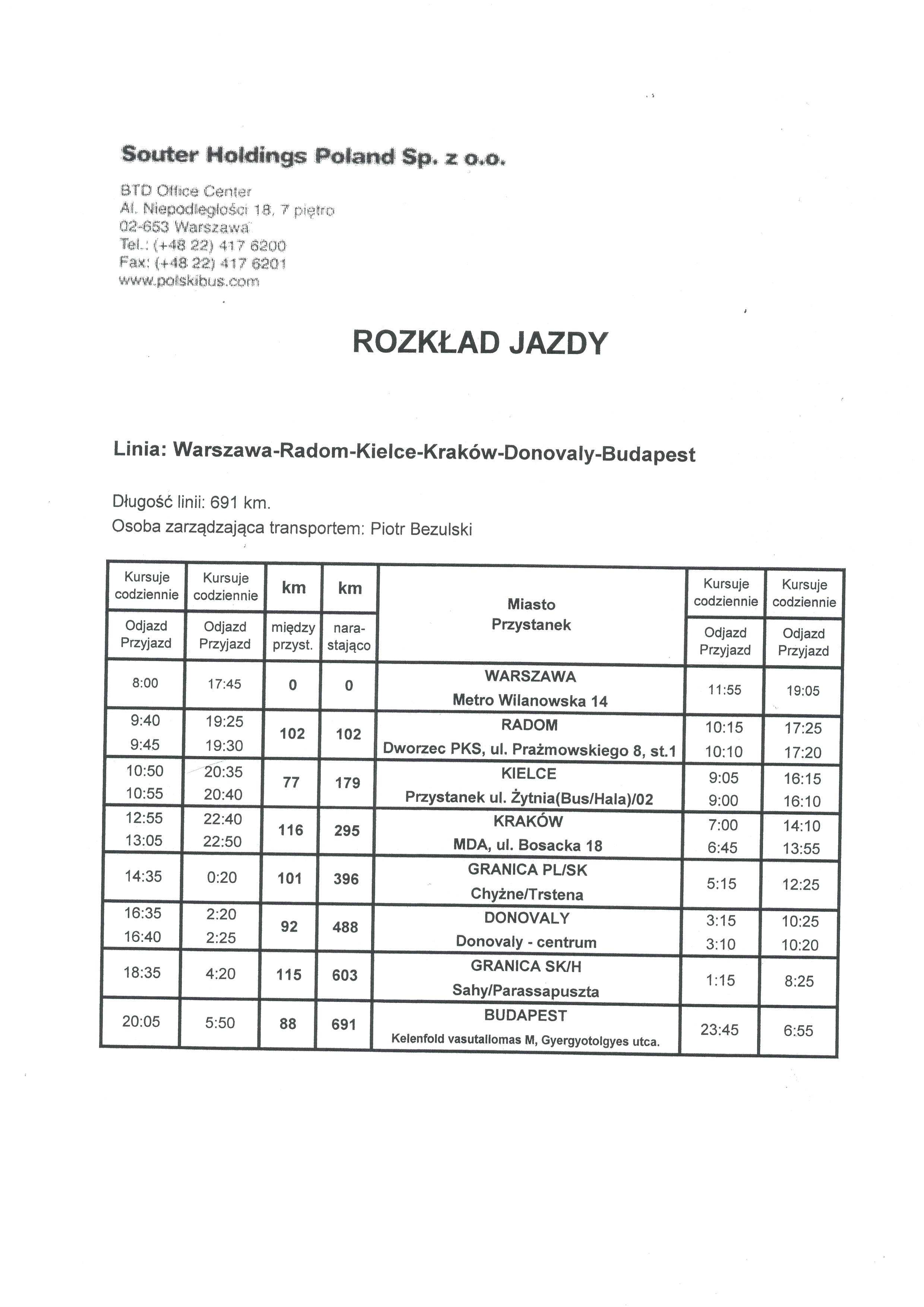 Viete o pravidelnej autobusovej linky z Poľska do Maďarska, a to z Varšavy cez Radom - Kielce - Krakov - hranica Chyžné-Trstená - Donovaly - hranica Šahy až do Budapešti a späť? Do Budapešti je to z Donovál necelé 3,5 hodiny jazdy, trasa Donovaly - Varšava trvá necelých 9 hodín jazdy.