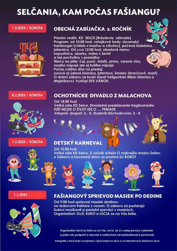 V ten istý deň 1. 3. 2025 si spolu užijeme aj tradičný FAŠIANGOVÝ SPRIEVOD masiek obcou, kde nám do kroku a do tanca zahrajú a zaspievajú naši heligonkári Miňo a Denis.